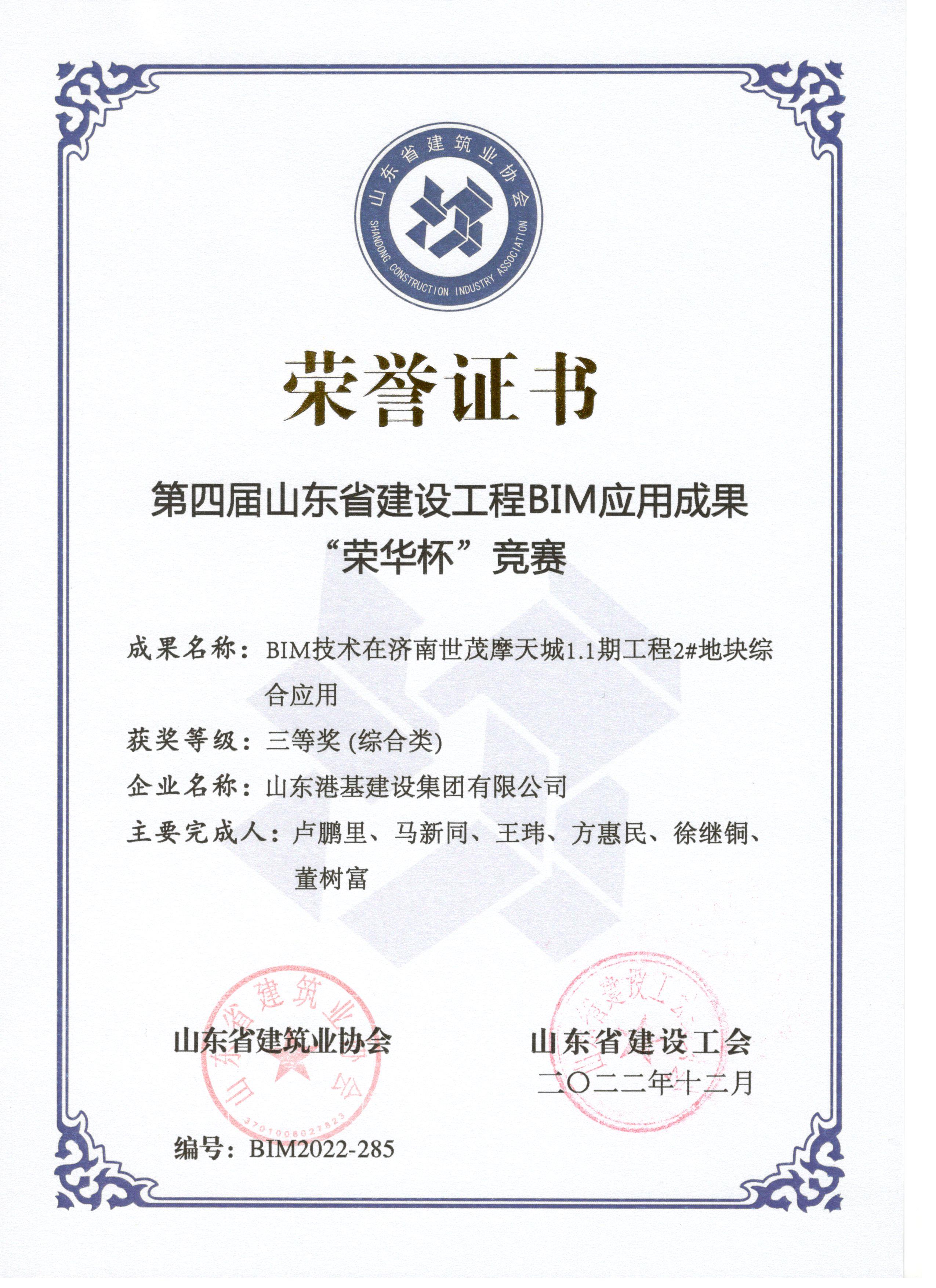 山東省建設工程BIM“榮華杯”競賽三等獎 |